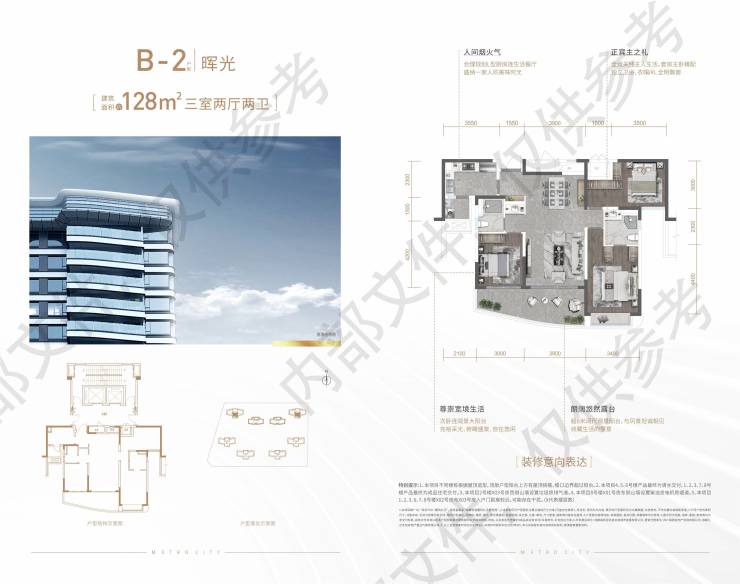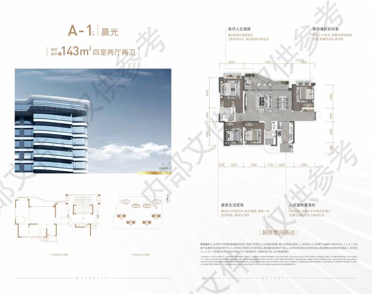 【信航天阅壹号】三环边全新首开_105-143㎡精装房_高得房率_售楼处电线;套四三卫LDKB方厅规划,双主卧户型得房率107%,套内实得面积约153m,比美商场其他产品170-180m实得面积(此户型,城北仅此本项目独有)143m套四三卫 端光厅规划,双主卧户型